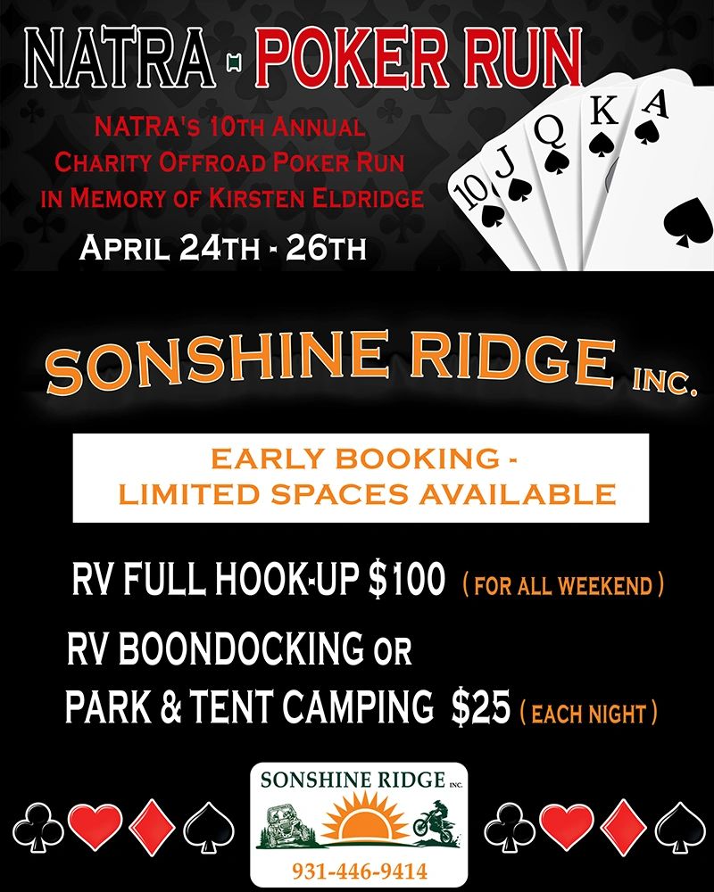 We are offering special camping rates for the weekend and easy access to the NATRA Trails from our campground! They will have a slew of events happening Friday Night and all Saturday at their event center at 102 Story Rd. WestPoint, TN
